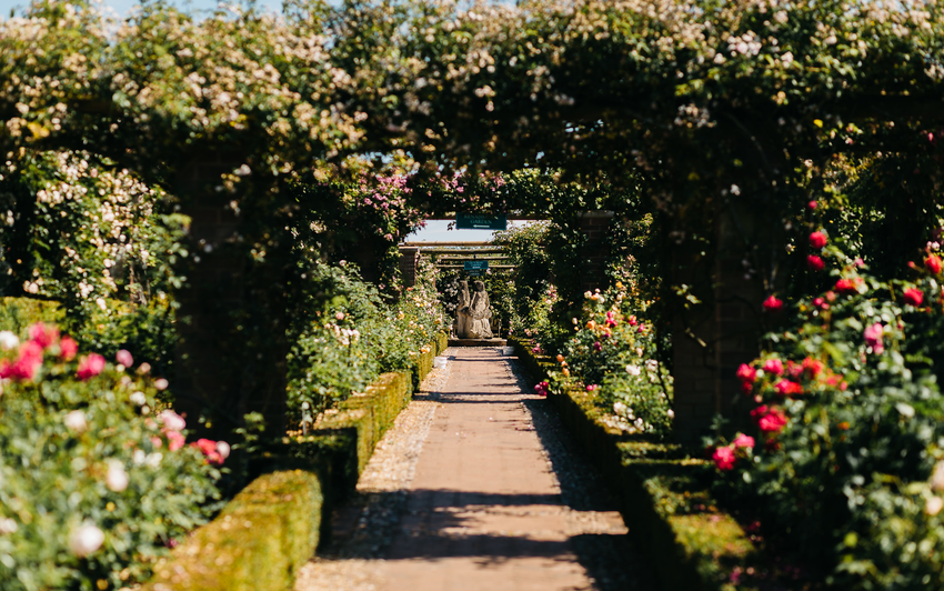The Victorian Walled Garden is a formal garden made up of three circular borders, which diminish in width towards the centre. They are planted with English Roses and other repeat-flowering shrub roses. The focal point of the garden is the large central stone carving. Visitors can also admire the natural beauty of the English Climbers and Ramblers trained over arches, arbours and along the eight foot wall which encircles the garden.