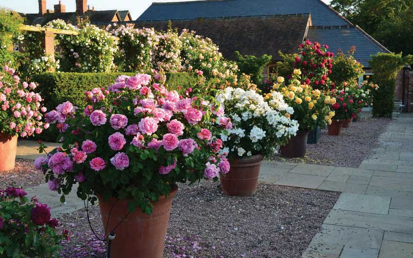 Our patio garden features English specimen roses in a variety of large, decorative terracotta planters. English Roses, with their gracefully rounded, shrubby growth, are ideal for growing in this way. They bring character and interest to the gravelled area around the Plant Centre and their beautiful, deliciously fragrant flowers can be easily enjoyed at close quarters.