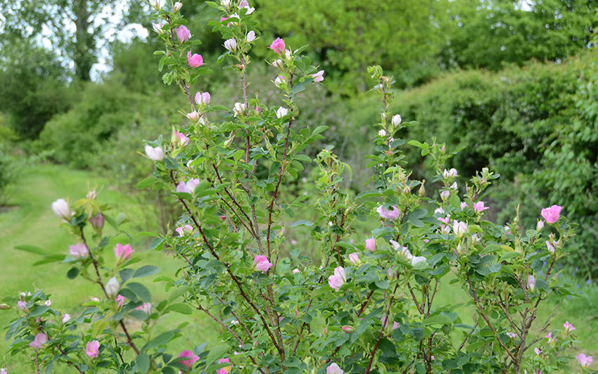 The Species Garden contains the true wild roses and their near hybrids. This is one of the first to flower and is at its most beautiful in early summer. After flowering, the hips develop and will be in full colour by the autumn. Birds can often be found in this garden, eating the seeds.