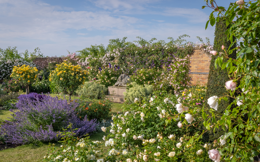 The Lion Garden is so called thanks to a lion sculpture by the late Pat Austin which provides a wonderful focal point to the space. Four long borders mingle shrub roses, including many English Roses, with herbaceous perennials, creating a wonderful contrast of colour, form, texture and scent. The borders are punctuated by magnificent standard tree roses, which add height and structure to the garden.